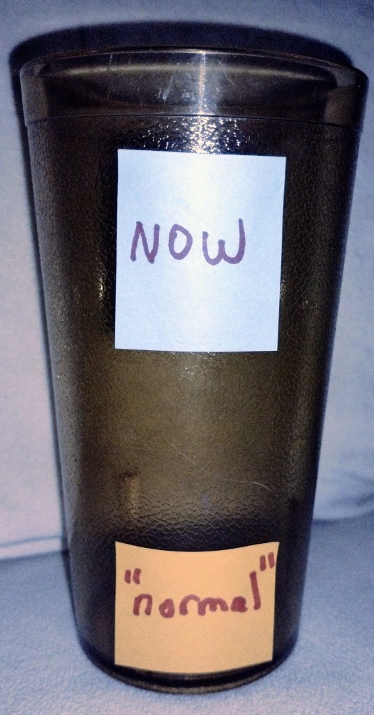 In the illustration, I used two differently colored sticky notes, one to illustrate how full that person is currently with regard to capacity and the other to indicate where that person normally functions. I use quotes with “normal” because that’s how I conceptualize it. That is, we all have a baseline for functioning, a “normal” if you will. With that baseline, there are fluctuations. We will have highs and lows. Most of all, what we are trying to avoid is extreme highs and extreme lows. My “normal” is not your “normal” and vice versa. In other words, our “normals” vary.