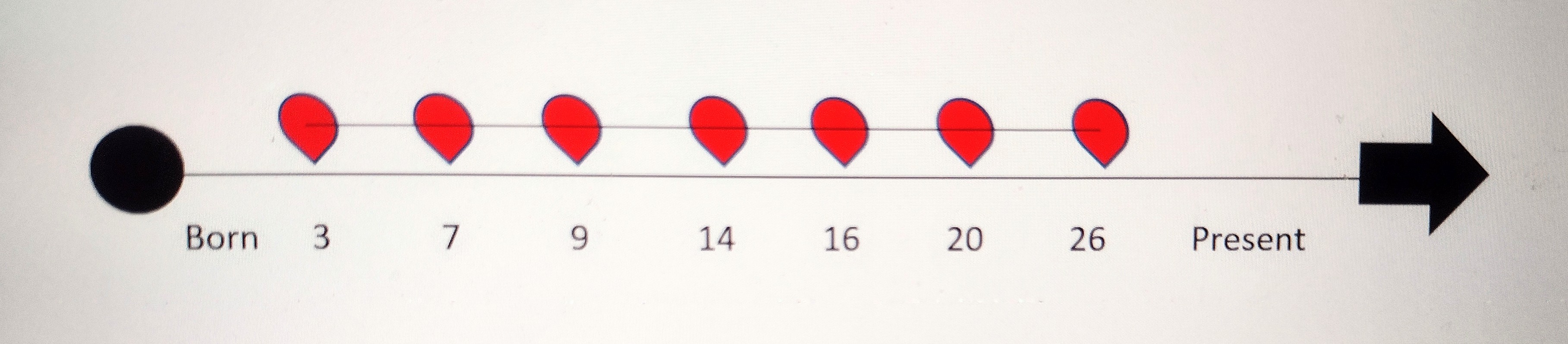 For the sake of simplicity, I did not try to create life as it’s actually represented graphically—you know the image, with things as we expect as a straight line and things as it is as a bunch of squigglies? Yeah, no. What you’re going to see is a birth point, some random ages throughout and a continuation arrow, indicating life is still happening.